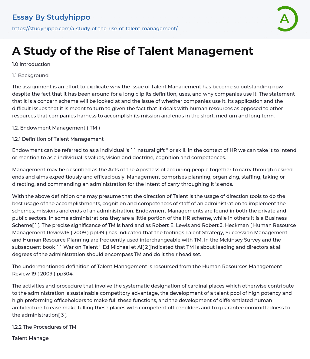 Recent alterations in engineering and the consciousness by companies that holding extremely talented employees will enable them ; like other resources of the concern ; a competitory advantage has led to the prominence of Talent Management.